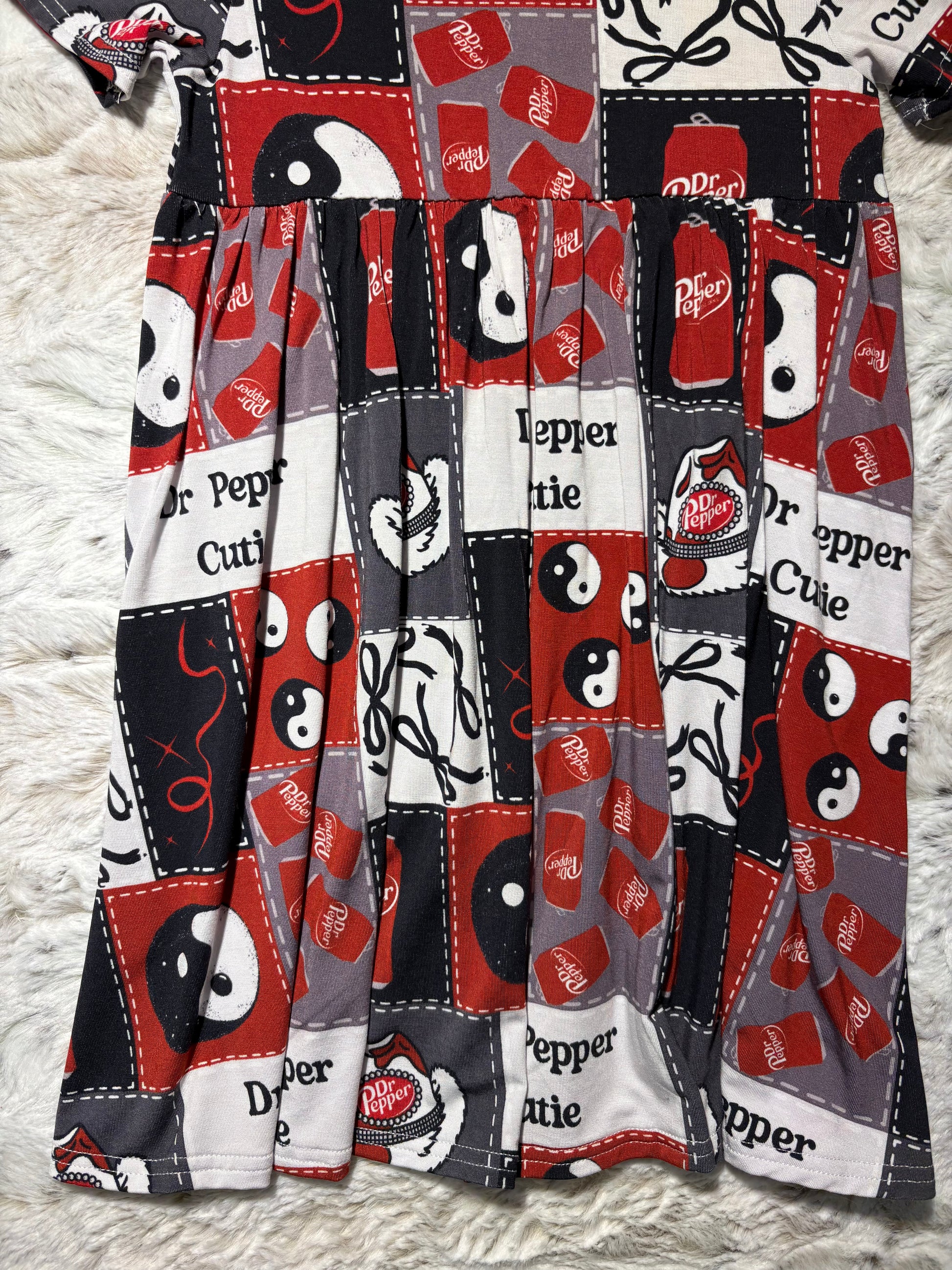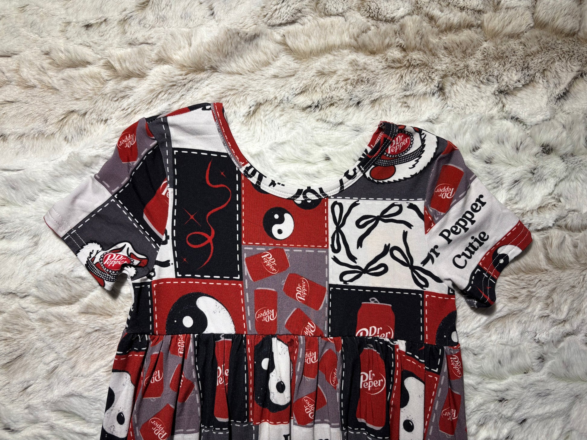 Sweet, bubbly, and full of personality! This adorable short-sleeve twirl dress features a unique patchwork-style print that combines classic Dr Pepper nostalgia with trendy graphics. From yin-yangs and dainty bows to that iconic "Dr Pepper Cutie" slogan, this dress is designed for the little one who is "one of a kind."