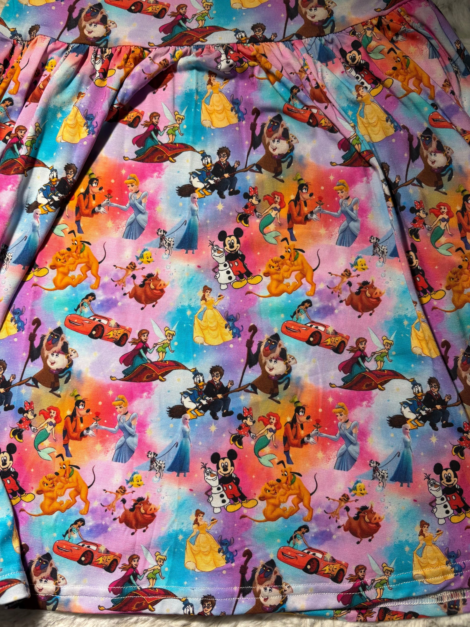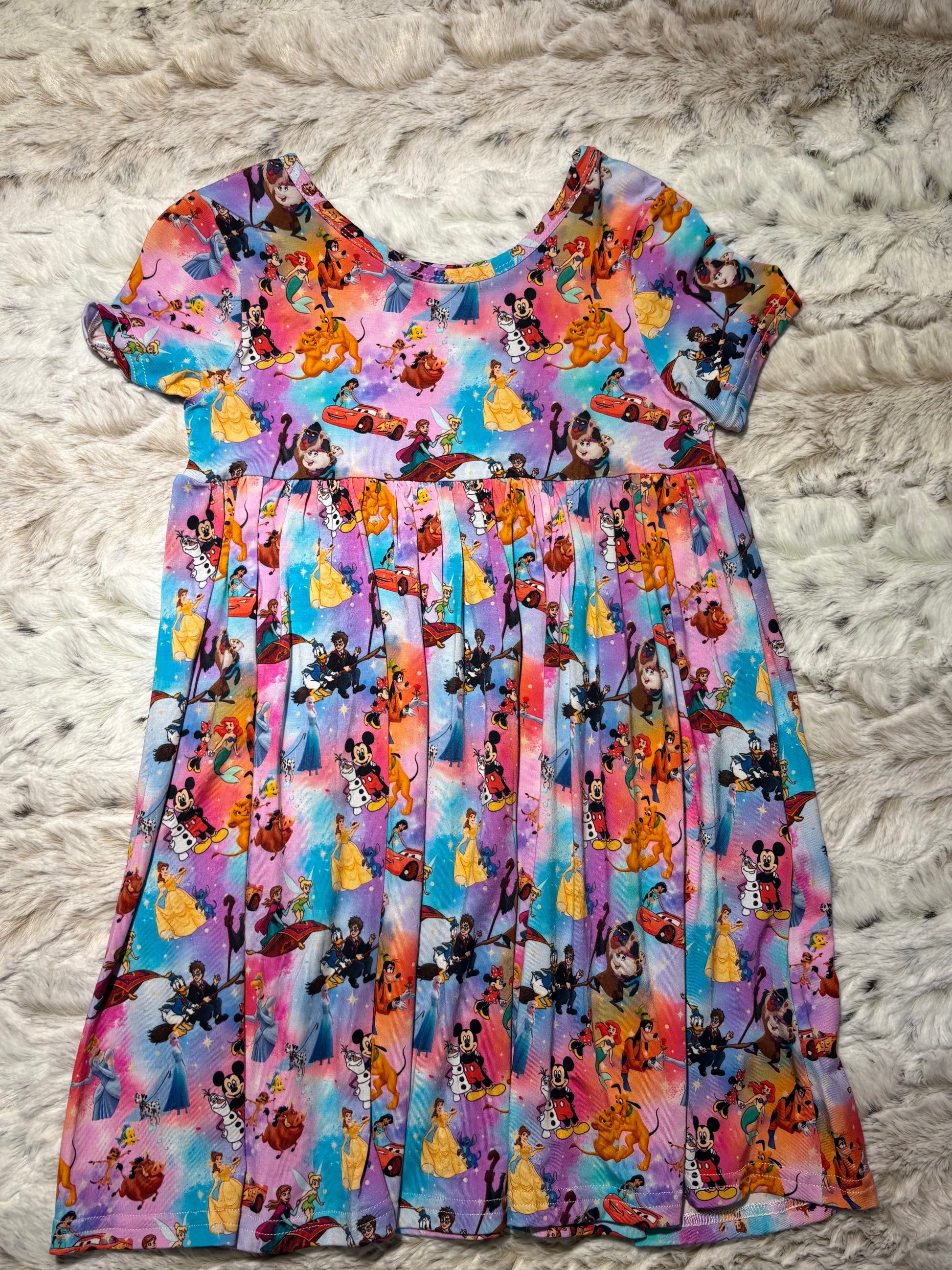 Can’t decide on just one favorite? Now you don’t have to! This vibrant and enchanting dress is the ultimate crossover, featuring a star-studded lineup of iconic characters. From beloved classic princesses and their trusty sidekicks to racing legends and playful toys, this print is a treasure trove of childhood wonder that will have your little one spotting someone new every time they wear it.