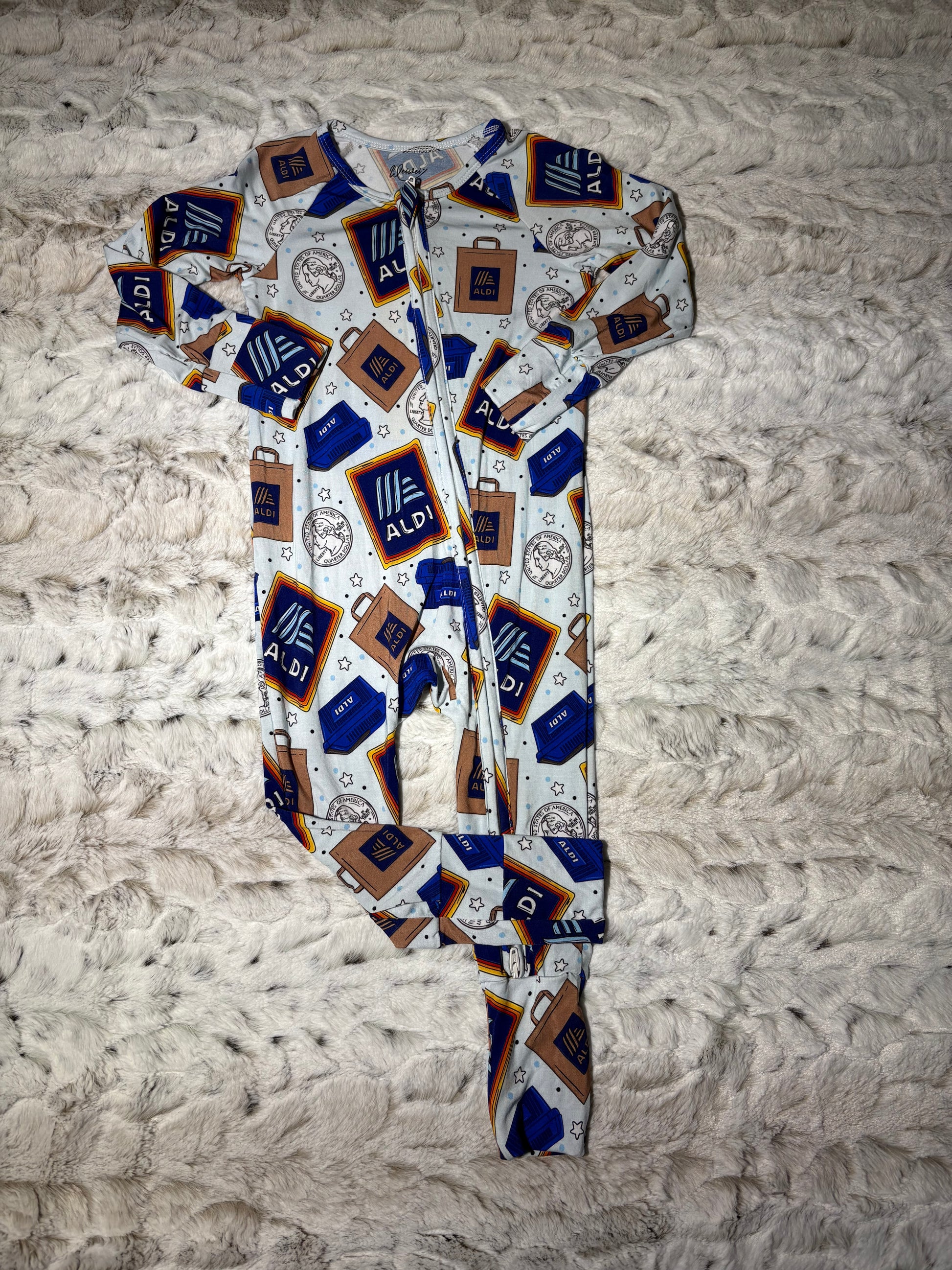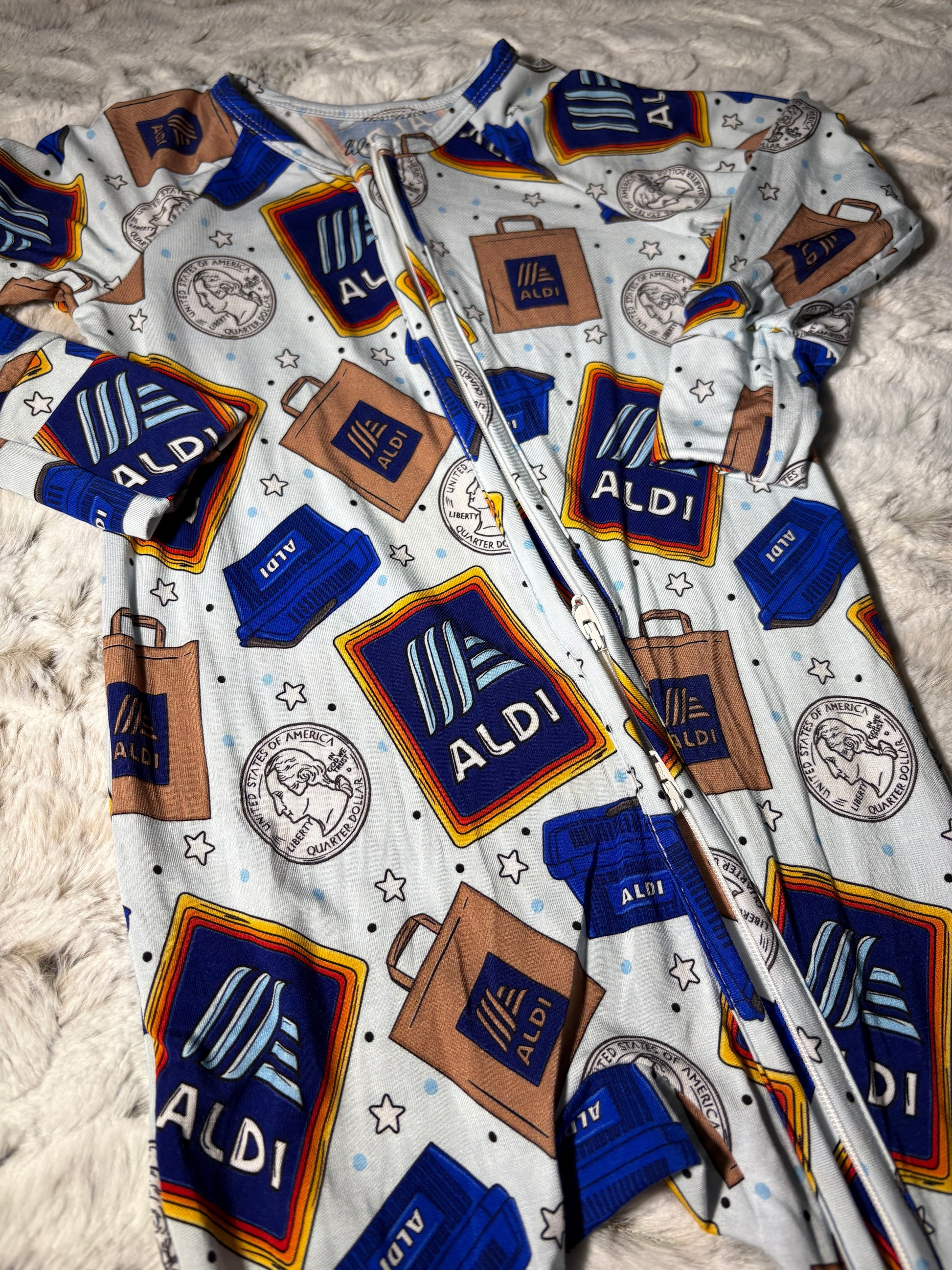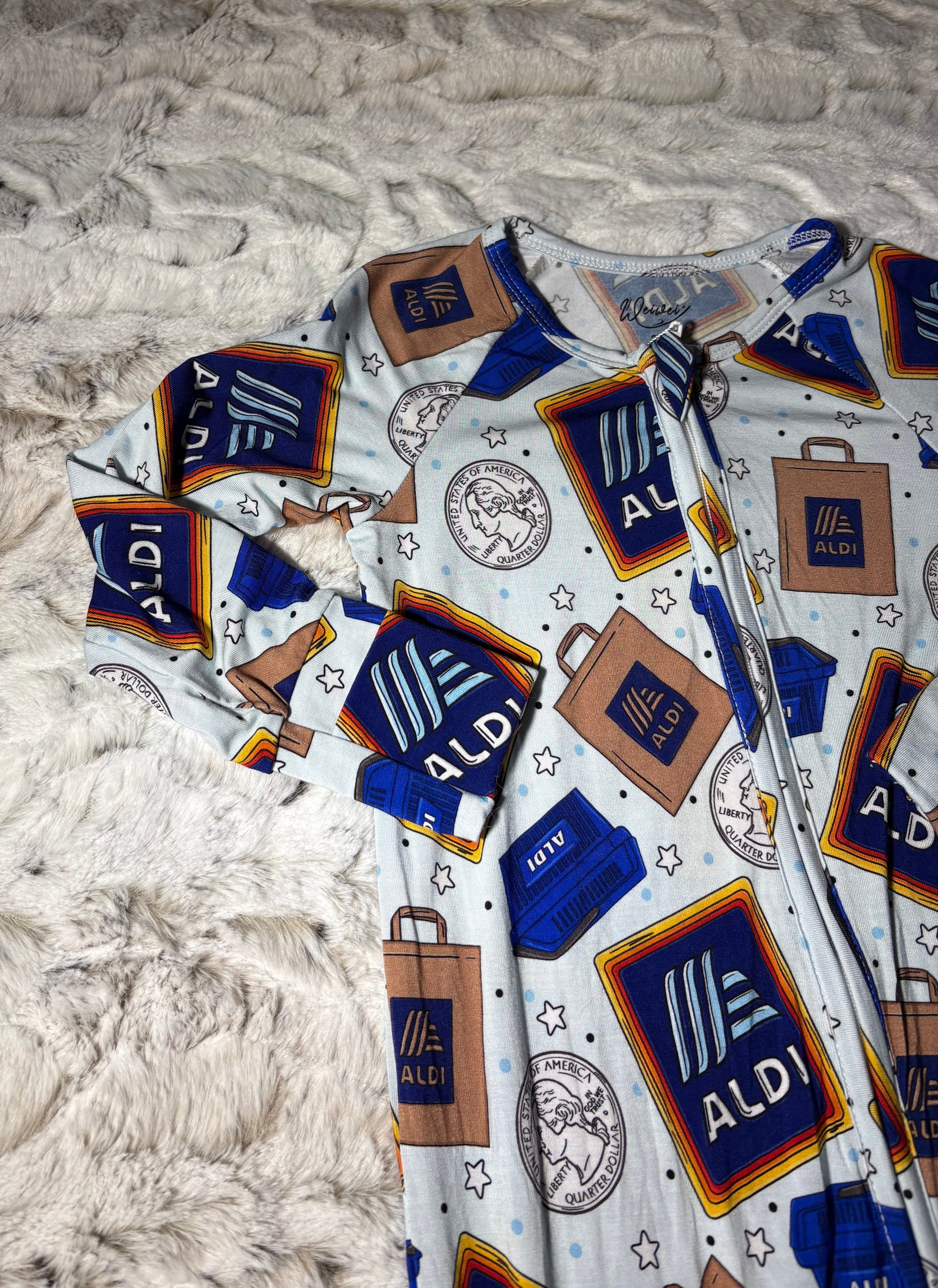 Celebrate your favorite grocery run with our ALDI-Inspired Bamboo Zippy. This playful print features the iconic ALDI logo, grocery bags, and blue shopping baskets, making it the perfect outfit for little ones who tag along on shopping adventures. It’s a quirky, fan-favorite design that brings a touch of everyday fun to bedtime.