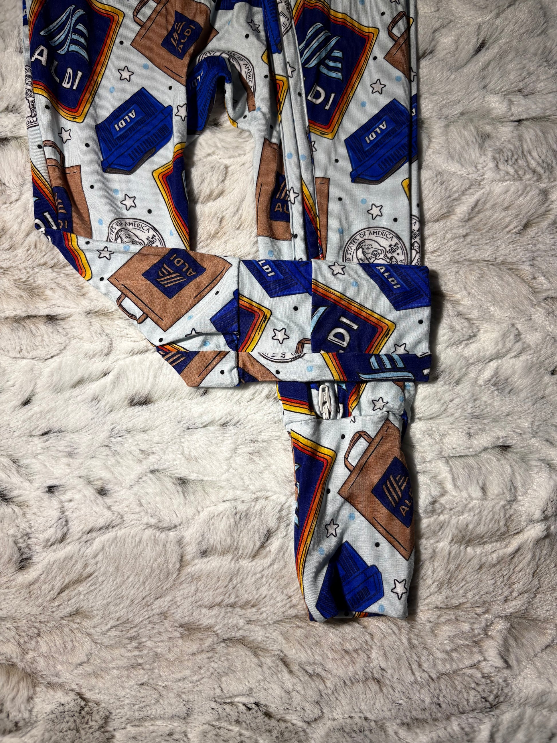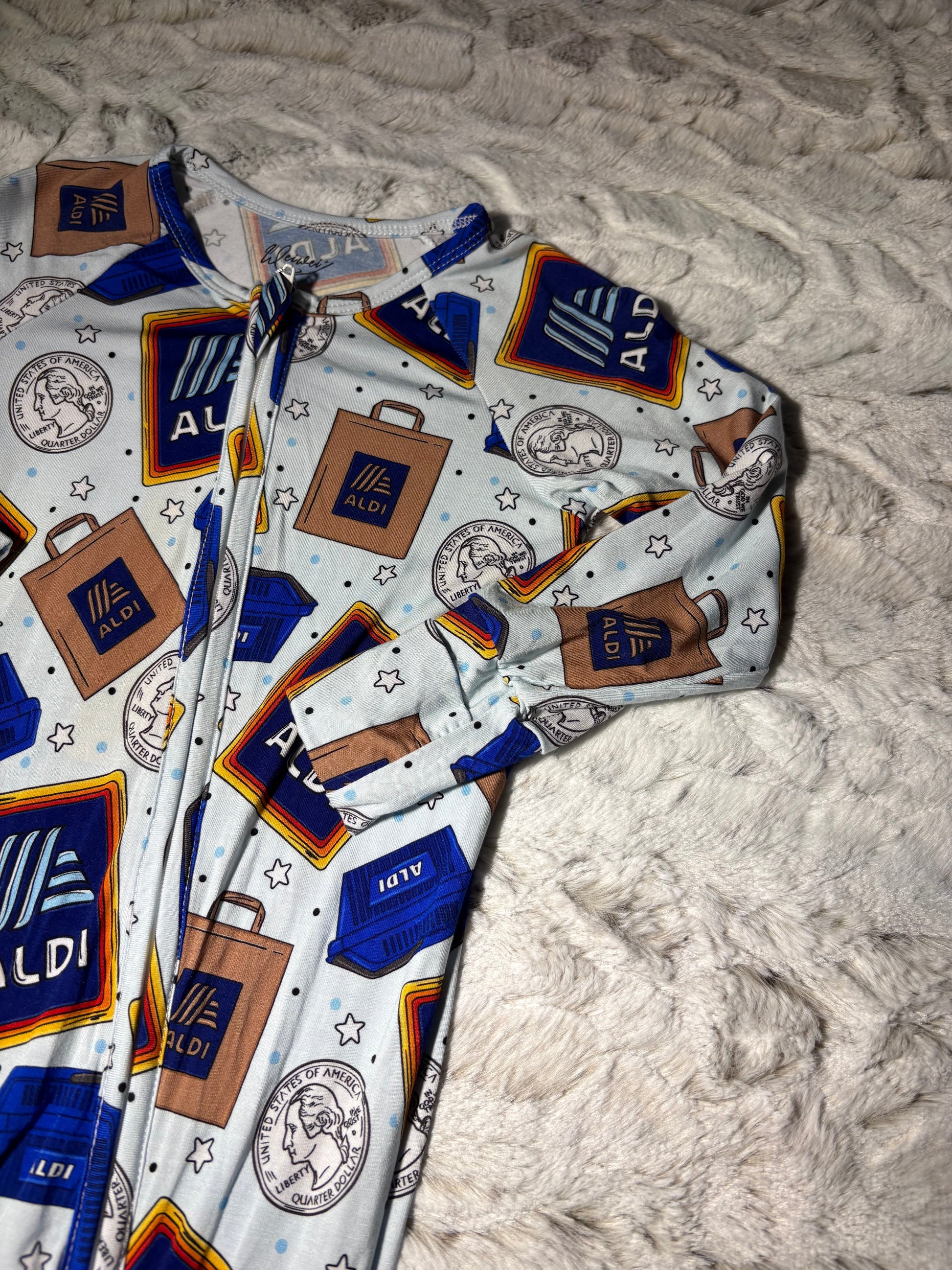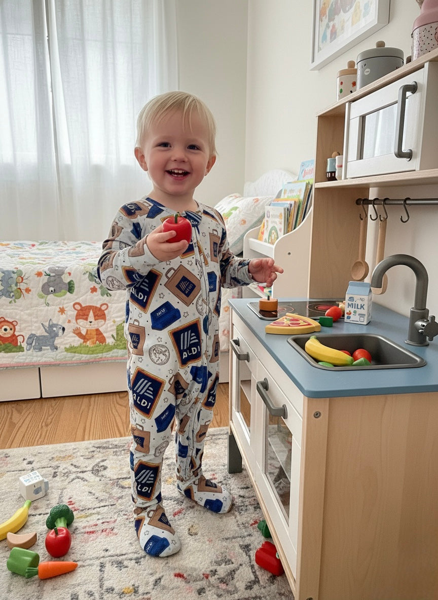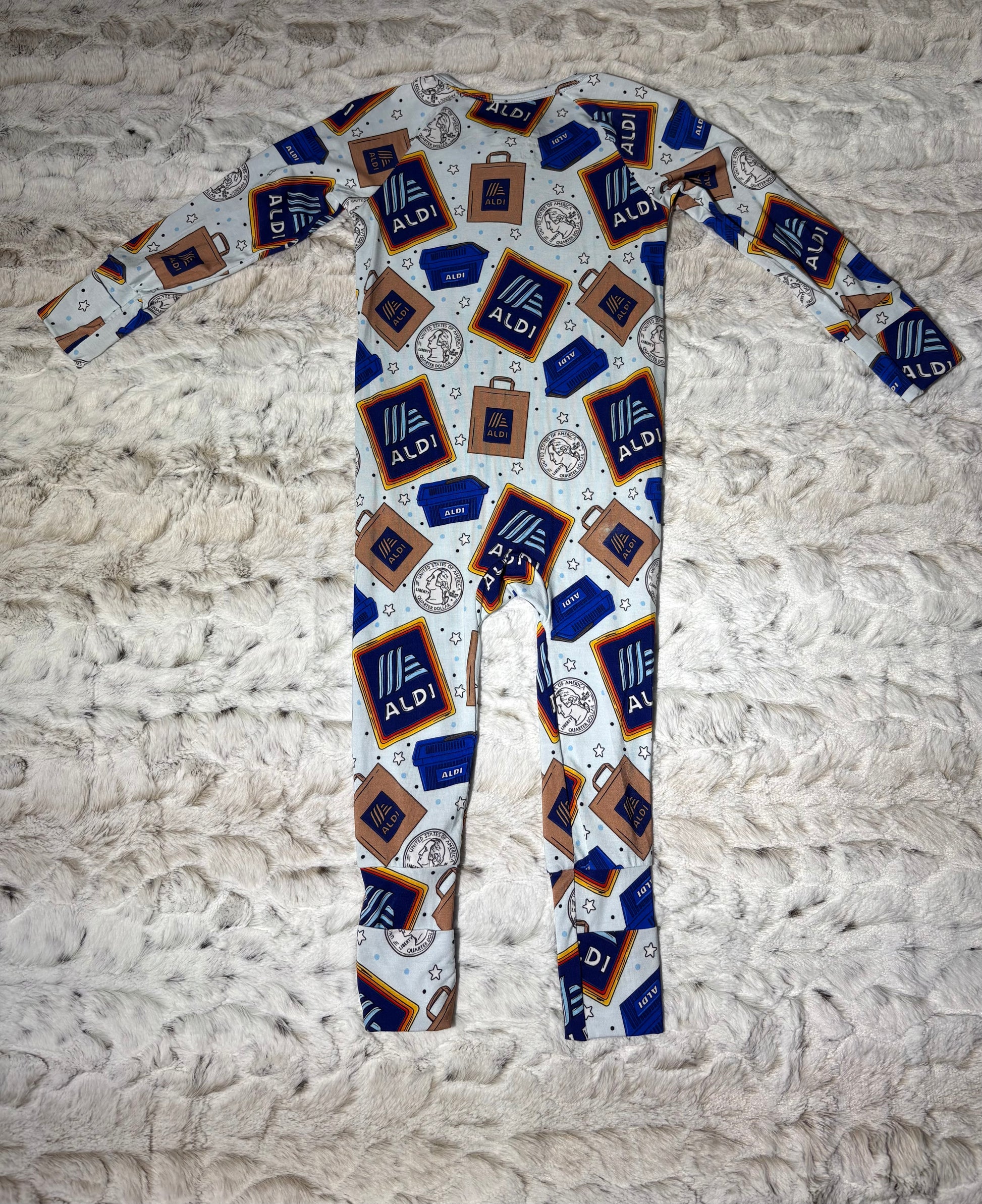Celebrate your favorite grocery run with our ALDI-Inspired Bamboo Zippy. This playful print features the iconic ALDI logo, grocery bags, and blue shopping baskets, making it the perfect outfit for little ones who tag along on shopping adventures. It’s a quirky, fan-favorite design that brings a touch of everyday fun to bedtime.