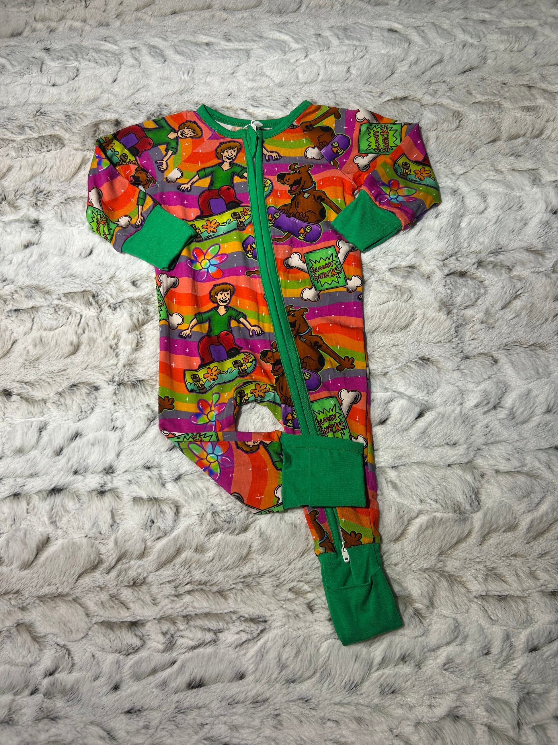 Get ready for some "Zoinks!" and giggles with our Scooby-Doo inspired bamboo romper. Featuring Shaggy and Scooby on skateboards amidst a sea of psychedelic rainbows and Scooby Snacks, this zippy is designed for ultimate comfort and maximum nostalgia. Whether they are solving mysteries or heading to dreamland, your little one will stay cool and cozy in this buttery-soft material.