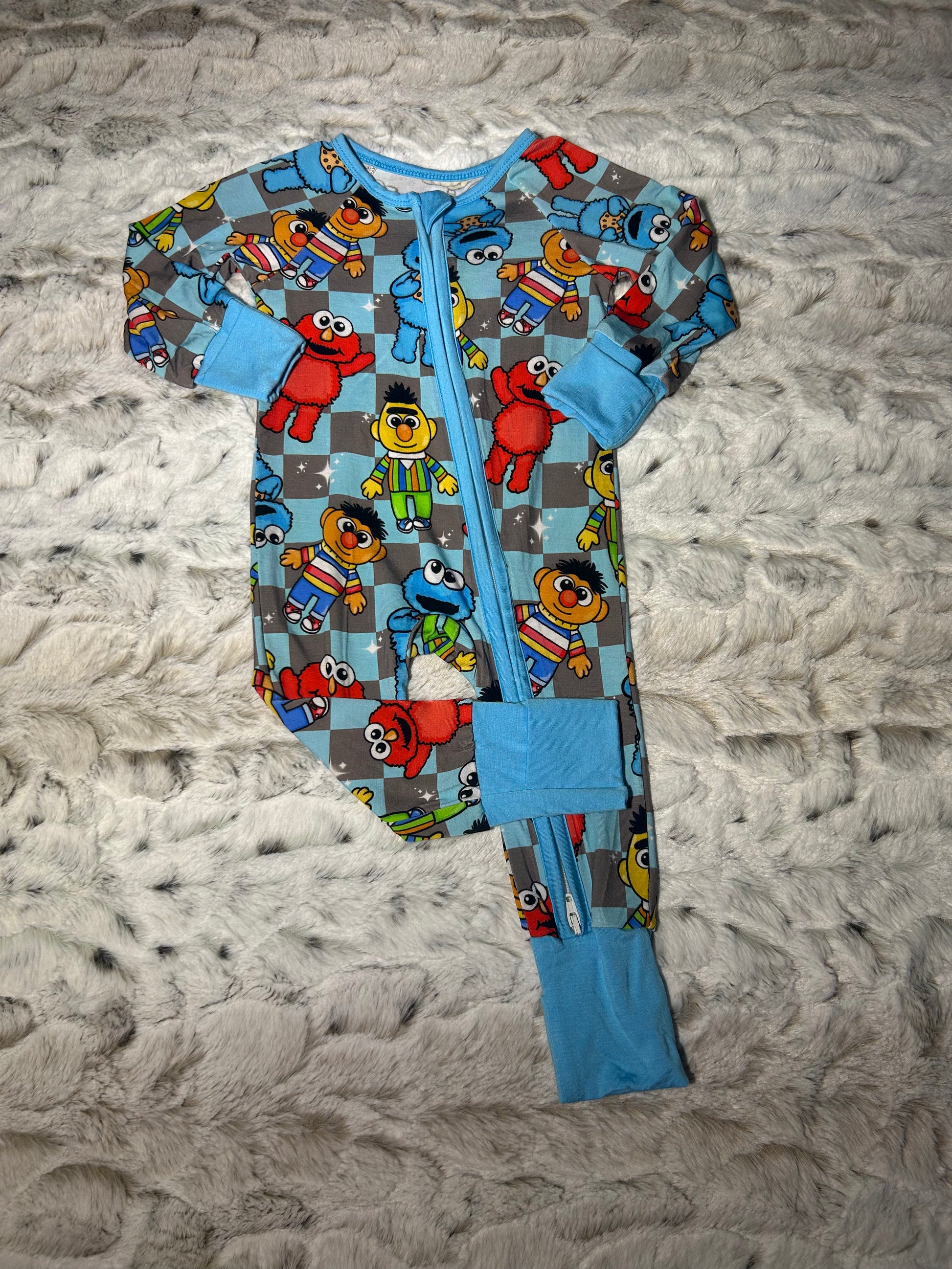 Bring the neighborhood to naptime with this vibrant, checkered Sesame Street romper. Featuring a playful all-over print of Elmo, Cookie Monster, Bert, and Ernie, this outfit is designed for both play and deep sleep.