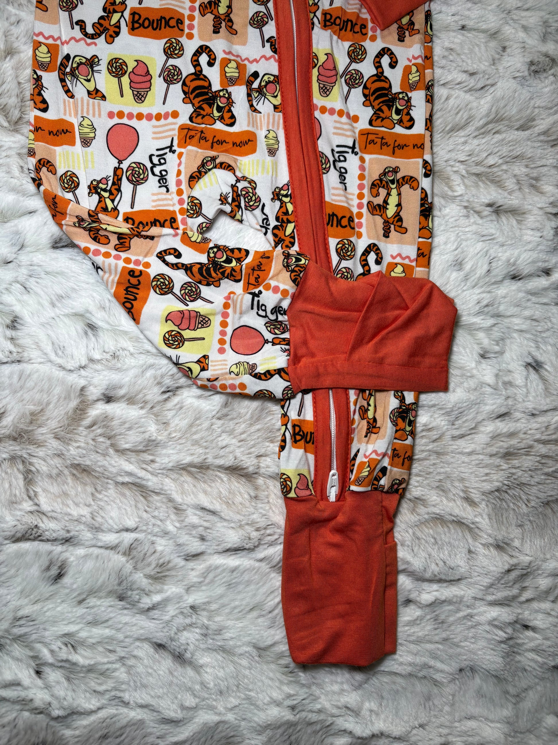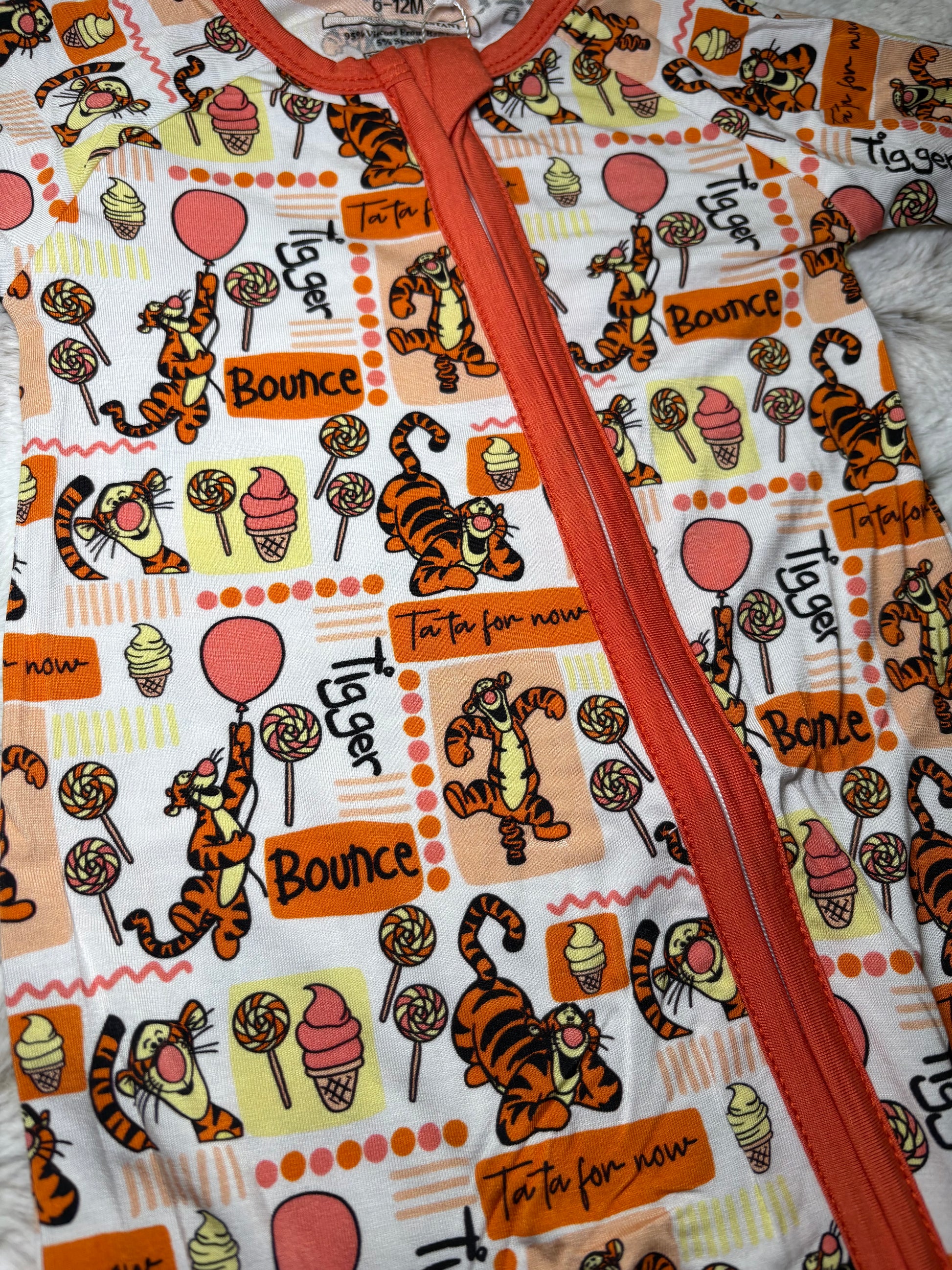 • Whimsical Tigger Print: A lively collage featuring the iconic Tigger in various "bouncing" poses, accented with retro treats like lollipops, ice cream cones, and colorful balloons.