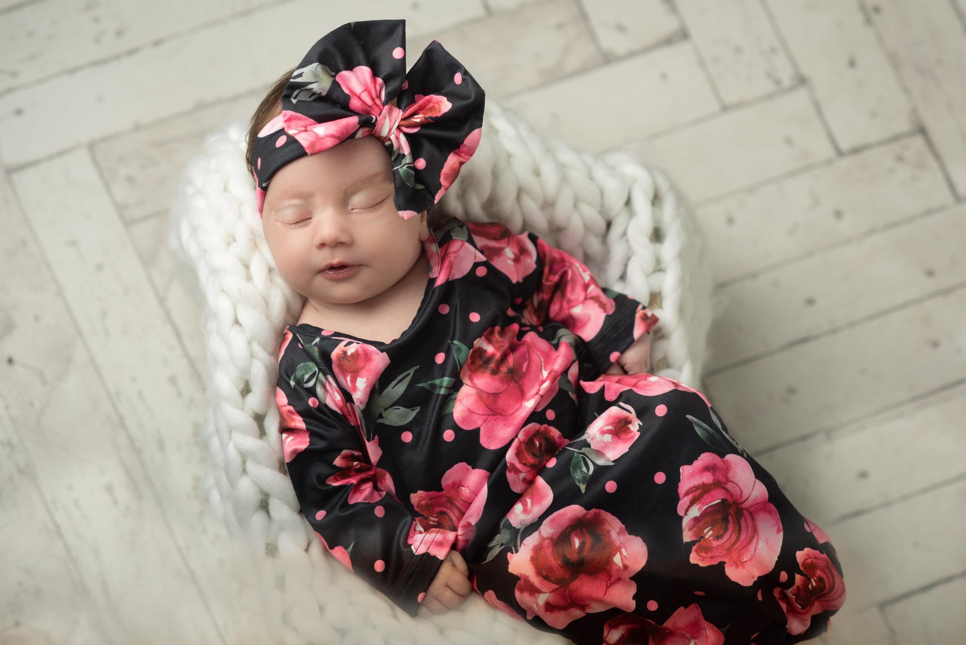 Enjoy this adorable Black Rose & polka dot print sleep gown for your precious new arrival. Our gowns are made of a quality 95% polyester and 5% spandex blend that leaves your babe feeling super soft & incredibly cozy. The sturdy elastic at the bottom allows parents quick access for diaper changes and will keep little toes tucked in during all hours of the day and night.