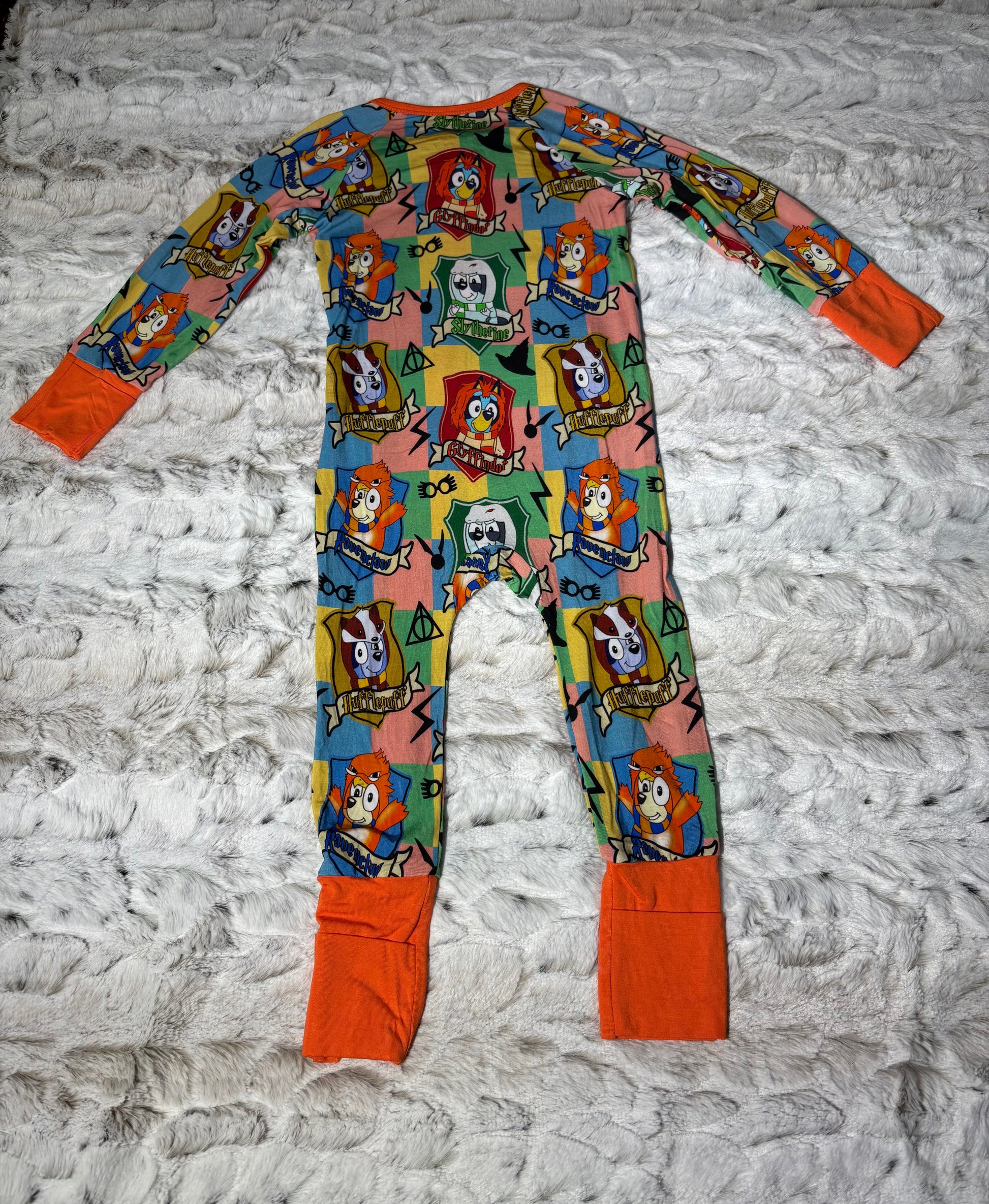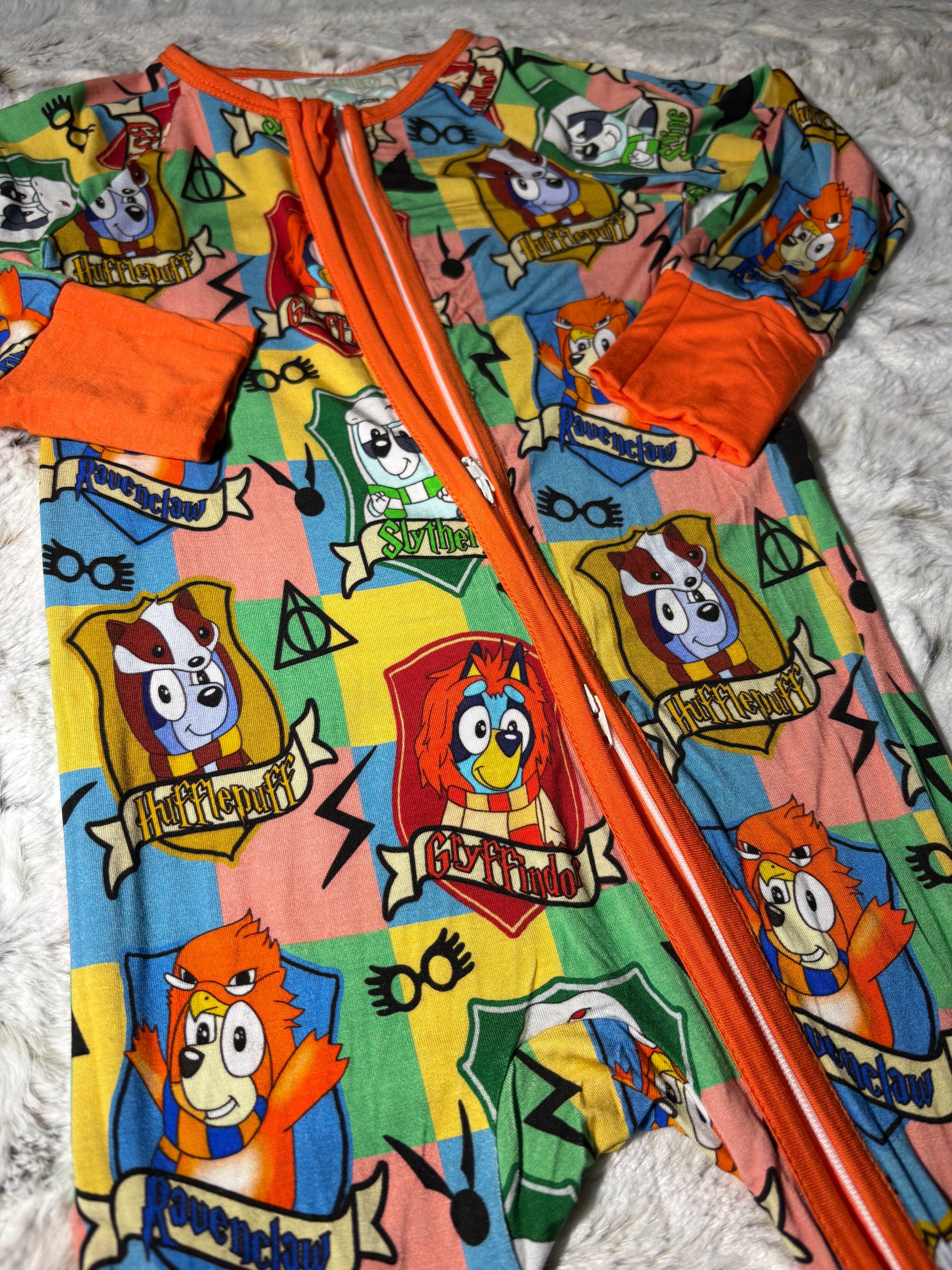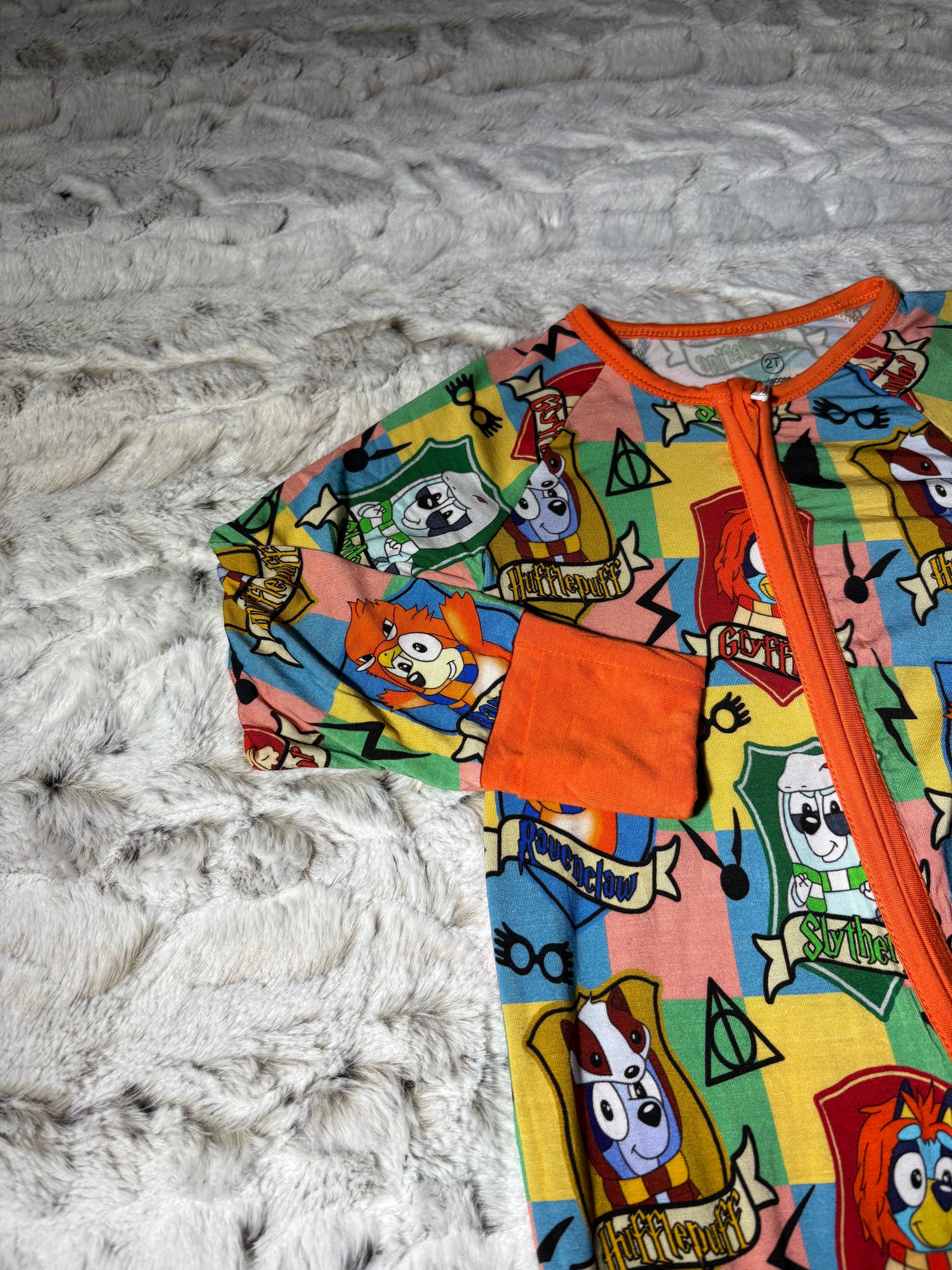 Accio comfort! Our Bluey House Bamboo Zippy brings a touch of magic to bedtime. This whimsical print features the Heeler family sorted into their "Wizarding Houses," complete with house crests, lightning bolts, and iconic glasses. Set against a colorful checkered background with vibrant orange cuffs, it’s the perfect sleeper for little fans of magic and imaginative play.