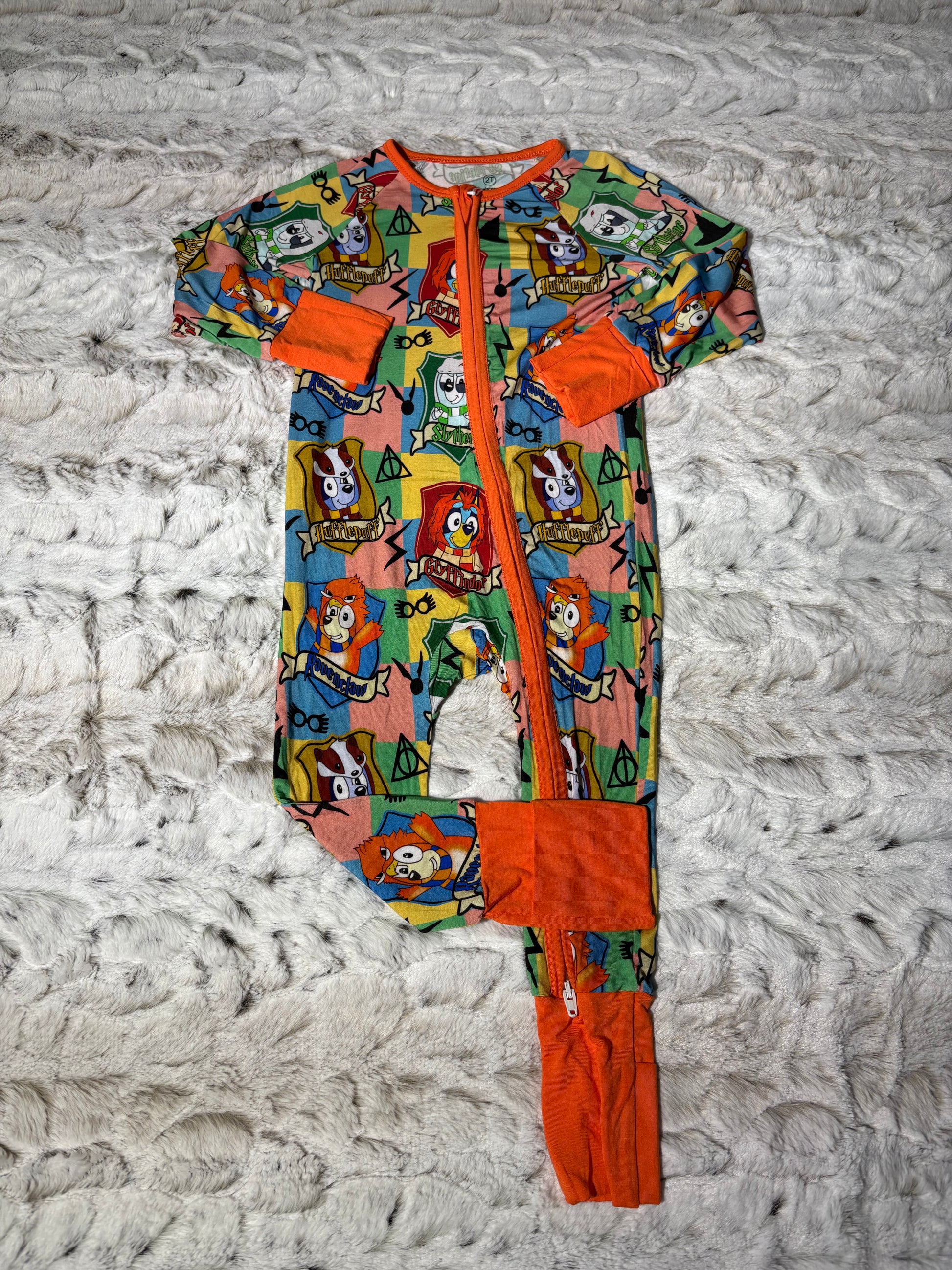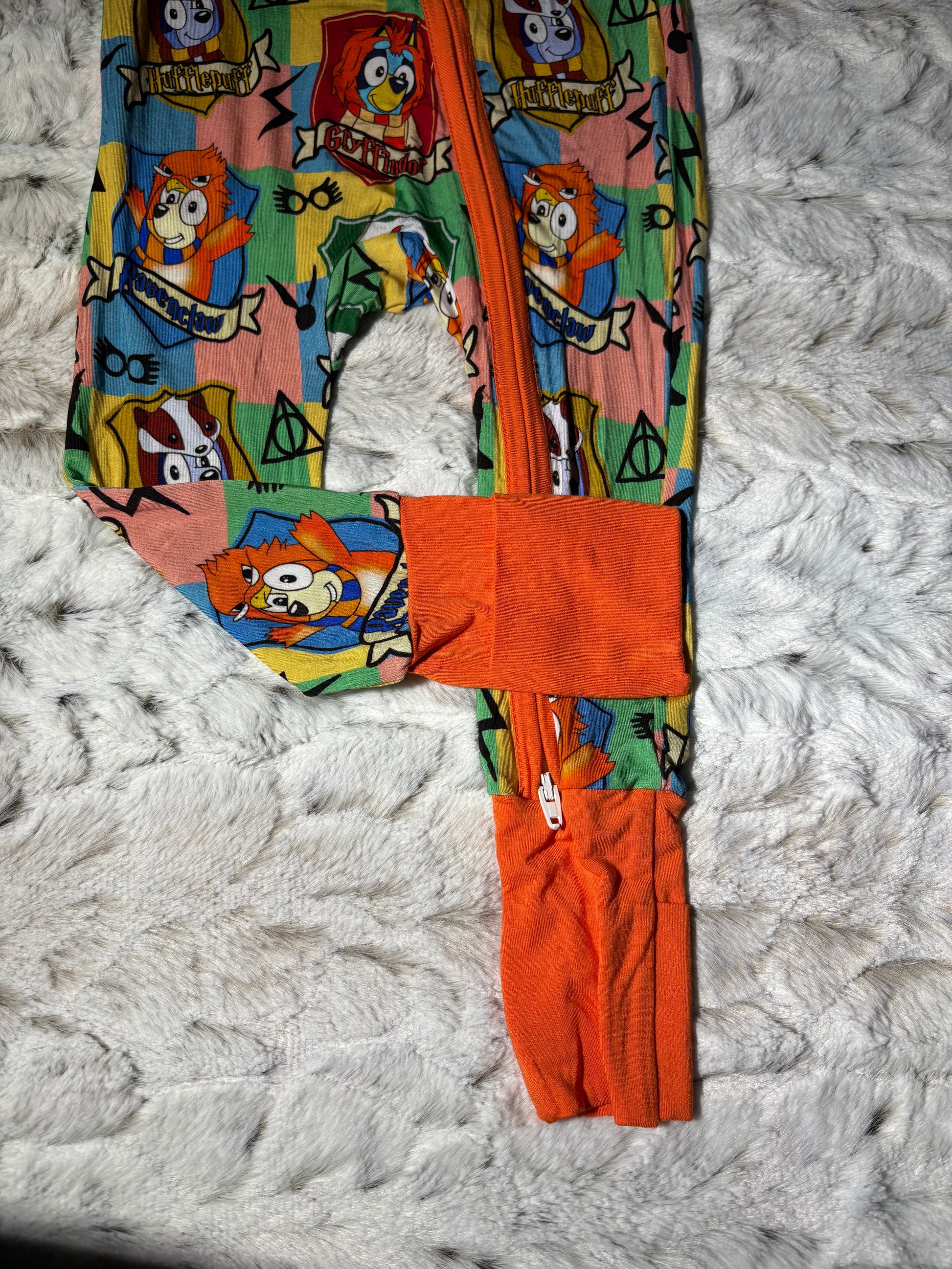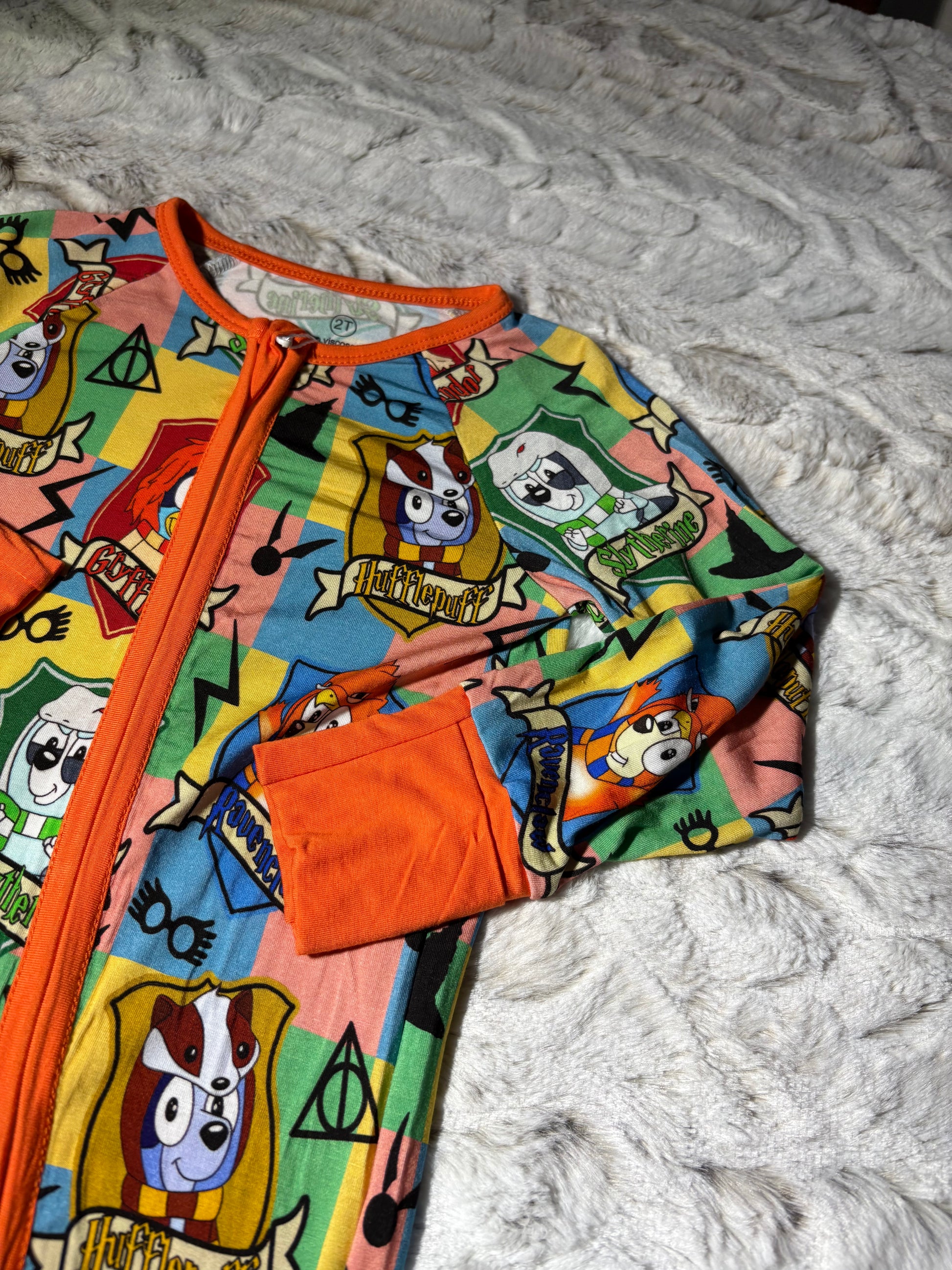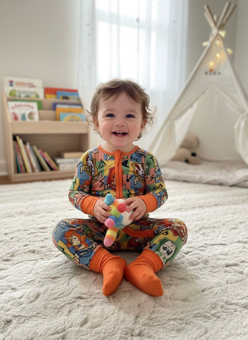 Accio comfort! Our Bluey House Bamboo Zippy brings a touch of magic to bedtime. This whimsical print features the Heeler family sorted into their "Wizarding Houses," complete with house crests, lightning bolts, and iconic glasses. Set against a colorful checkered background with vibrant orange cuffs, it’s the perfect sleeper for little fans of magic and imaginative play.