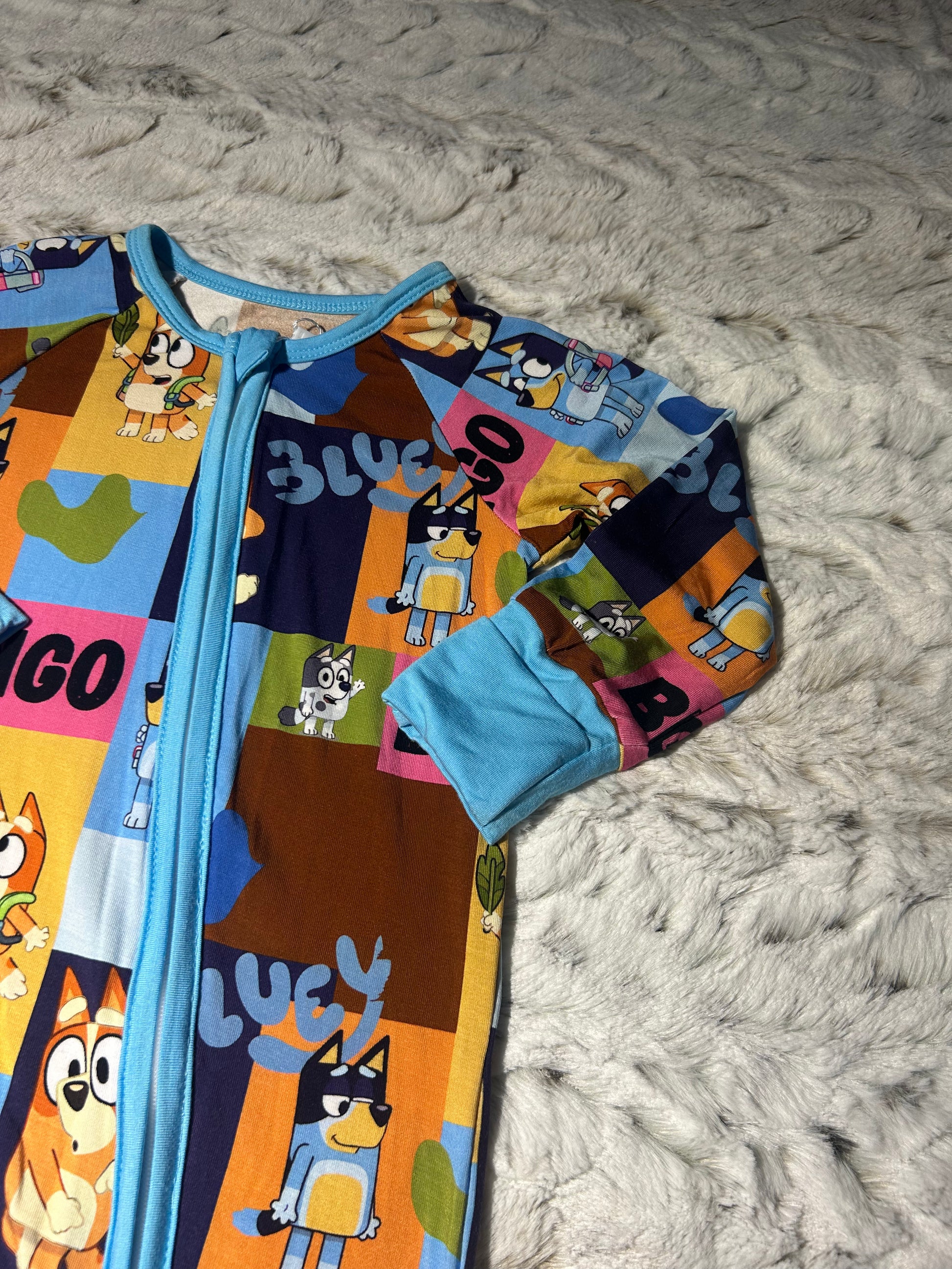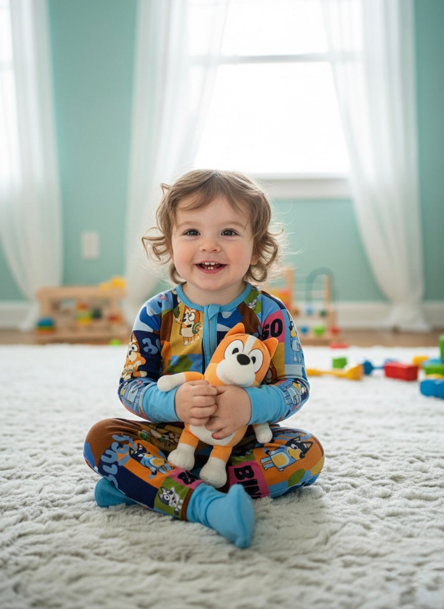 Get ready for "For Real Life" adventures with our Bluey & Bingo Bamboo Zippy! This vibrant one-piece sleeper features the beloved Heeler sisters, Bluey and Bingo, in a colorful patchwork design alongside their names and iconic symbols. It’s the perfect outfit for imaginative play and cozy snuggles, bringing the magic of everyone's favorite show right into bedtime.