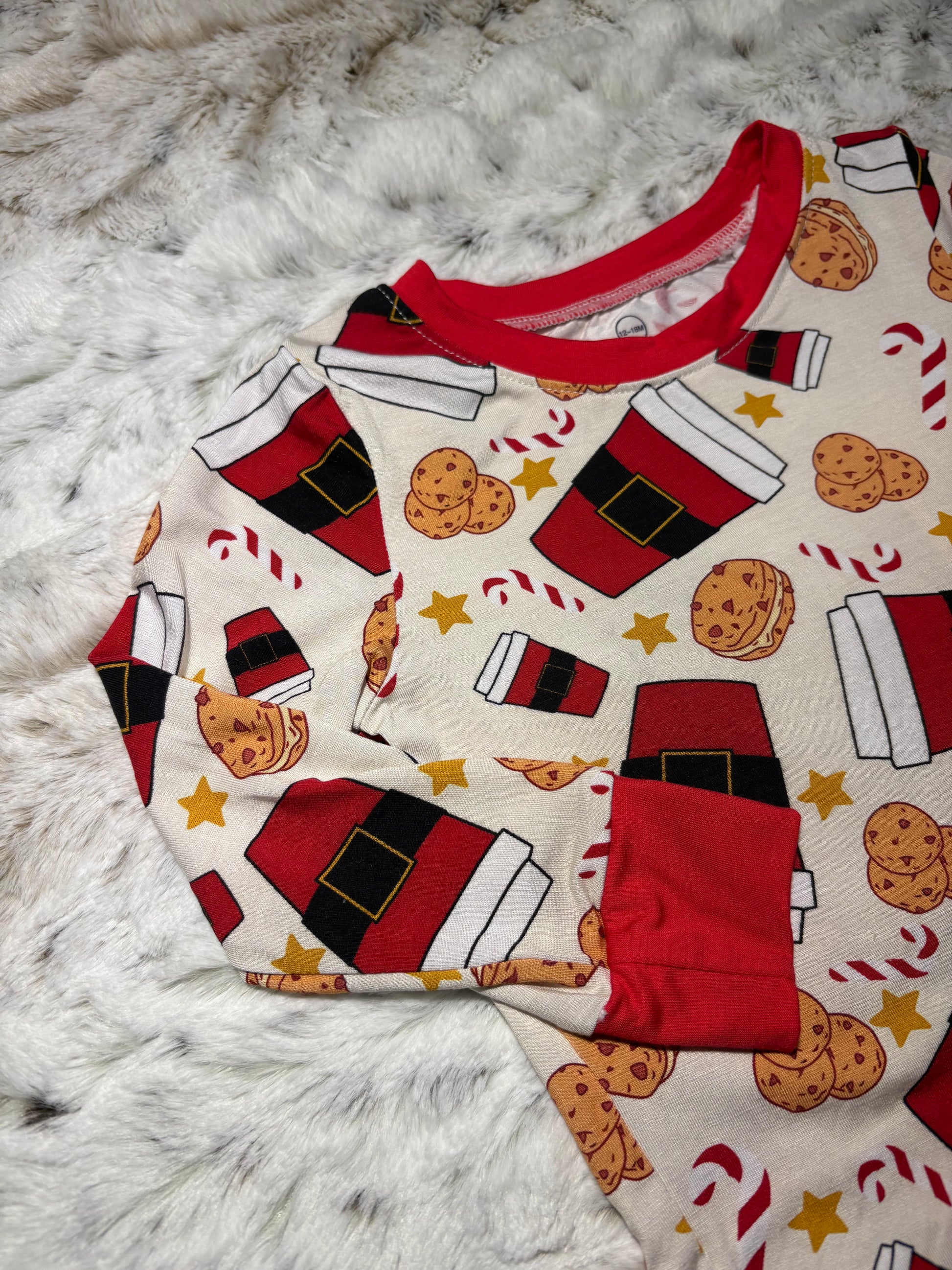 Even Santa needs a caffeine kick! This cozy and festive set features a delightful holiday print of "Santa suit" milk cup, delicious chocolate chip cookies, candy canes, and stars. It is the perfect outfit for Christmas morning, baking cookies, or simply staying cozy all winter long.