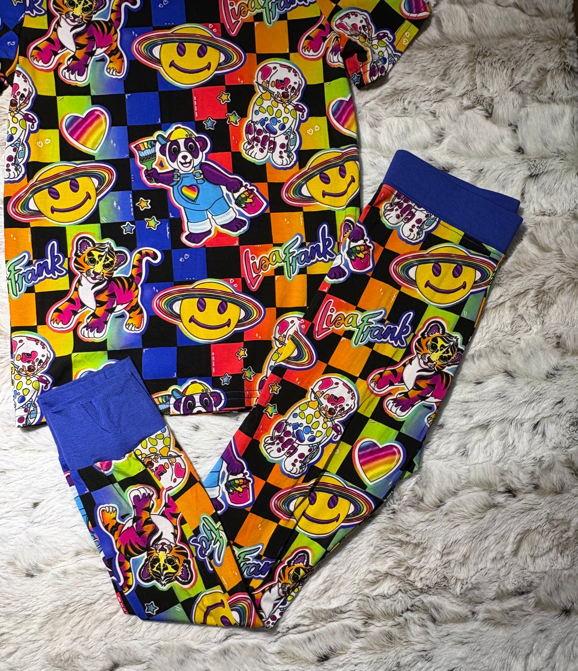 Bring back the magic of the 90s with this vibrant, ultra-colorful Lisa Frank pajama set! Featuring a whimsical blend of neon rainbows, checkered patterns, and beloved characters like Hunter the Leopard and Pura the Panda, this set is designed for maximum fun and ultimate comfort. Whether it's for a cozy movie night or sweet dreams, this outfit is a bold statement piece for any rainbow lover.
