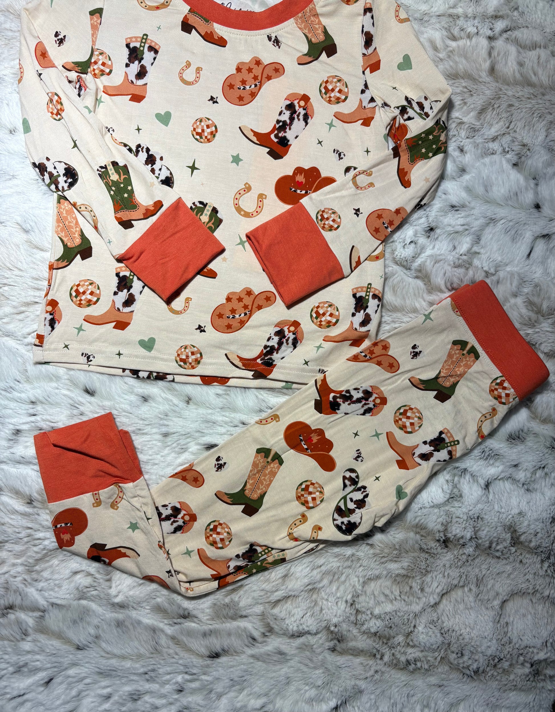Giddy up and glow! This adorable set combines classic Western charm with a fun, modern twist. Featuring a playful print of glittery cowboy boots, star-patterned hats, golden horseshoes, and sparkling disco balls, it’s the perfect gear for your little one to dance their way through the day or drift off into a magical night’s sleep.