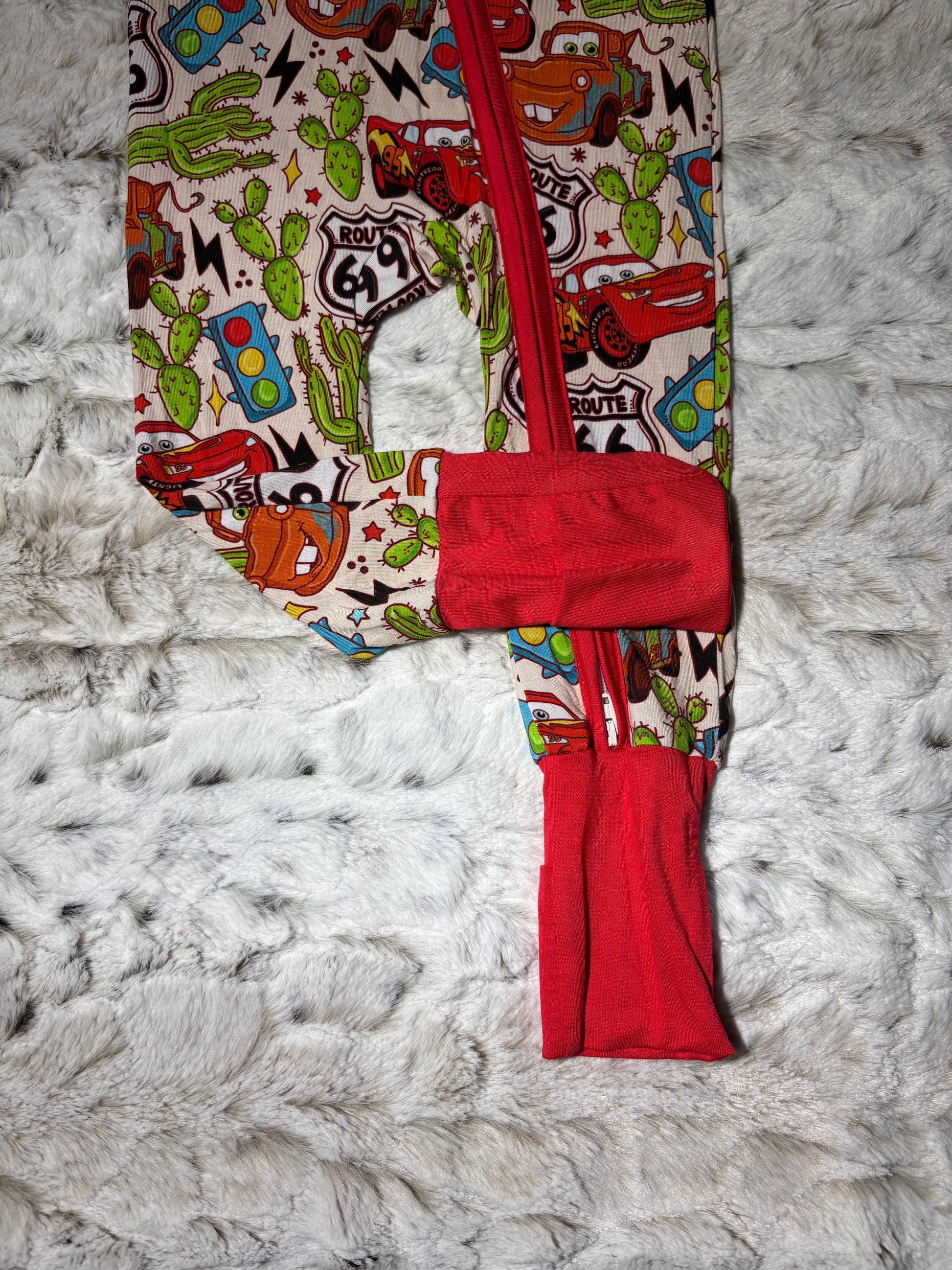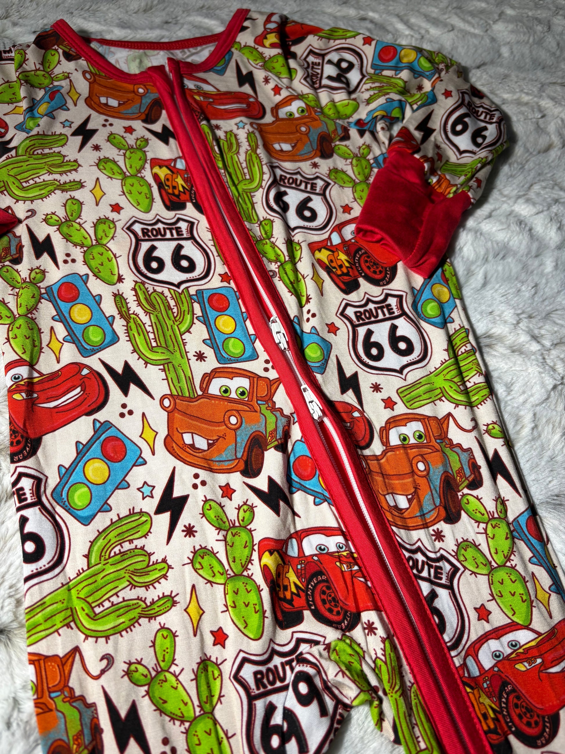 Rev up for the most comfortable pit stop ever! This high-speed sleeper features a vibrant desert racing scene with favorite red and rusty racing friends zipping past Route 66 signs, cacti, and lightning bolts. It’s the perfect gear for your little racer to drift off into dreamland at top speed.
